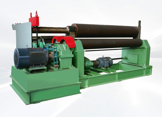 該機(jī)結(jié)構(gòu)型式為三輥非對(duì)稱(chēng)式,下輥為主傳動(dòng),并做垂直升降運(yùn)動(dòng),以便夾緊板材。通過(guò)下輥齒輪與上輥齒輪嚙合,同時(shí)作為主傳動(dòng),側(cè)作傾升降運(yùn)動(dòng)。具有預(yù)彎、卷圓多重功能,結(jié)構(gòu)緊湊操作維修方便