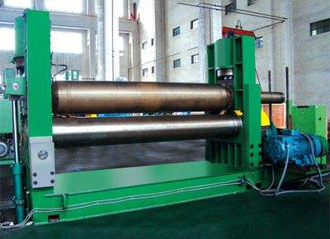 本機(jī)結(jié)構(gòu)型式為三錕對稱式,上輥在兩下輥中央對稱位置作垂直升降運(yùn)動,通過液壓缸內(nèi)的液壓油作用于活塞而獲得,為液壓傳動;兩下作旋轉(zhuǎn)運(yùn)動,通過減速機(jī)的輸出齒輪與下輥齒輪嚙合為卷制板材提供扭矩。本機(jī)床結(jié)構(gòu)緊,操作維修方便。