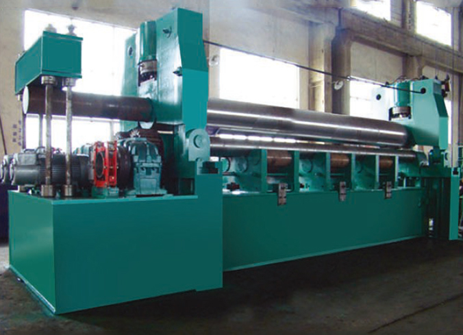 本機(jī)結(jié)構(gòu)型式為三錕對稱式,上輥在兩下輥中央對稱位置作垂直升降運(yùn)動,通過液壓缸內(nèi)的液壓油作用于活塞而獲得,為液壓傳動;兩下作旋轉(zhuǎn)運(yùn)動,通過減速機(jī)的輸出齒輪與下輥齒輪嚙合為卷制板材提供扭矩。本機(jī)床結(jié)構(gòu)緊,操作維修方便。