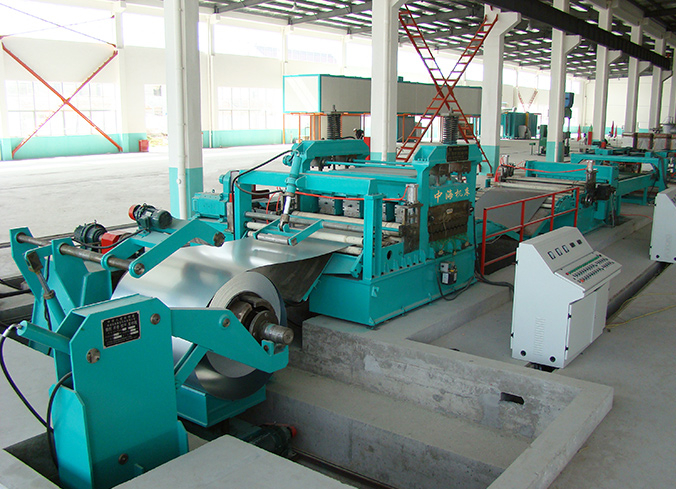 該生產線是將較薄金屬卷板整平、剪切成塊狀板材的專用設備。通常由上料小車、開卷機、托板壓引裝置、校平主機、活動過橋、導向糾偏裝置、定尺機構、覆膜裝置、剪板機、輸送工作臺、氣動排料架、液壓升降垛料臺、運料滾道臺及液壓系統、電氣控制系統等組成,協同動作PLC控制。